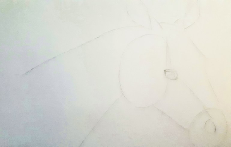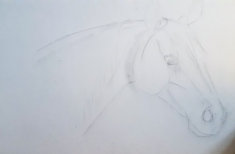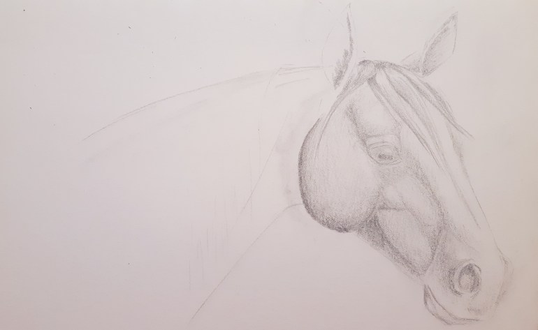 I like to think of drawing (or painting) an image as drawing shapes and their relationships with others. So my first step after selecting my subject is to take a close look at it and decide what shapes it’s made up of. For instance in this picture, you can see the horse’s cheek is an oval, the mouth and nose is a circle, the ears and eyes are made up of diamond shapes and the neck and muzzle are cylinders. I apologize for how light this image is, but when you are first building up your image, light lines are a lot easier to erase and adjust!